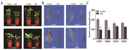 Morphological phenotypes of four sunflower germplasms under salt stress. Ten-day-old seedlings of the genotypes 182265, 182283, 182093, and 186096 were subjected to a 350 mM NaCl stress for a period of five days. A parallel set of seedlings were treated with distilled water as controls. (A) The above-ground phenotype; (B) root contour; (C) total root length. The scale bars were marked at 10 cm. Significant differences between the control and salt-stressed seedlings of the same germplasm were denoted by asterisks, as determined by Duncan’s multiple range test following a post hoc analysis. (** p < 0.01).
