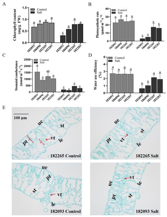 Comparative analysis of photosynthetic characteristics and leaf anatomical structures between salt-tolerant and salt-sensitive sunflower genotypes under salt stress. (A) Chlorophyll content; (B) Photosynthetic rate; (C) Stomatal conductance; (D) Water use efficiency. (E) Microscopic views of the leaf anatomical structures of genotypes 182265 and 182093. The images were captured at an original magnification of 100×. The anatomical features were labeled as follows: Ue, upper epidermis; le, lower epidermis; pt, palisade tissue; st, spongy tissue; pt and st were collectively classified as parenchyma. vt, vascular tissue. The arrows indicated the location of the vascular tissue. Significant differences (p < 0.05) among all the samples of the four sunflower germplasms under both control and salt treatment were denoted by different letters.
