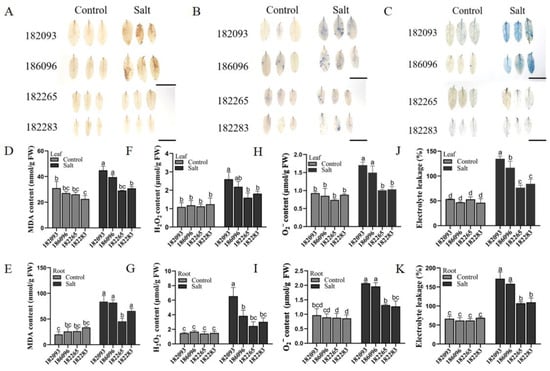 Comparative cell membrane damage in salt-tolerant and salt-sensitive sunflower germplasms under salt stress. (A–C) Histochemical staining for cellular damage using DAB, NBT, and Evans blue in the leaves, respectively. (D–K) Quantitative analysis of MDA, H2O2, and O2− contents, and electrolyte leakage rate in the leaves and roots of four sunflower germplasms. The scale bars represented 5 cm. Different letters denoted significant differences among all the samples of the germplasms in control and treatment with 350 mM NaCl for 5 days (p < 0.05).