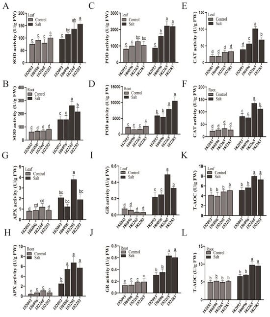 Antioxidant enzyme activities in salt-tolerant and salt-sensitive sunflower germplasms. (A–L) The activities of SOD, POD, CAT, APX, GR, and the T-AOC in both leaves and roots. Data were presented as the mean of three biological replicates. Different letters indicated significant differences among all the samples of the four germplasms in control and treatment with 350 mM NaCl for 5 days (p < 0.05).