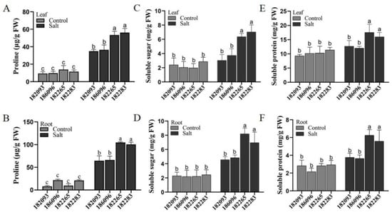 The accumulation of compatible osmotic solutes, such as proline, soluble sugars, and soluble proteins, serves as a vital mechanism for enhancing salt tolerance in plants. In an analysis of four sunflower genotypes, it was observed that salt stress induced an average increase in proline content of 34.93% in leaves and 36.42% in roots for the salt-tolerant genotypes 182265 and 182283, compared to the salt-sensitive genotypes 182093 and 186096 (Figure 5A,B). Similarly, the levels of soluble sugars and soluble proteins followed the same trend as proline (Figure 5C–F). The average contents of soluble sugars, and soluble proteins in different tissues of the two salt-tolerant genotypes 182265 and 182283 were 49.49%, 37.98% in roots, and 35.75% and 26.34% higher in leaves than those in the salt-sensitive genotypes 186096 and 182093. Indeed, salt-tolerant sunflowers exhibit a significant accumulation of osmolytes in response to salt stress, which plays a crucial role in their tolerance mechanisms.