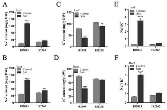 Leaves or roots were first oven-dried at 80 °C to a constant weight. The dried samples were then ground into a fine powder, and a 40-mesh sieve was used to eliminate large particles. A total of 0.3 g powdered sample was ashed in a crucible at 560 °C for 5 h, and after ashing, 1.5 mL H2SO4 was added to the crucible for complete dissolving the ash. The Na+ and K+ contents of the dissolved ash were then measured using a flame photometer (AP1500, Shanghai, China). The entire experiment was performed by Jiangsu Addison Biotechnology Co., Ltd., Suzhou, China.