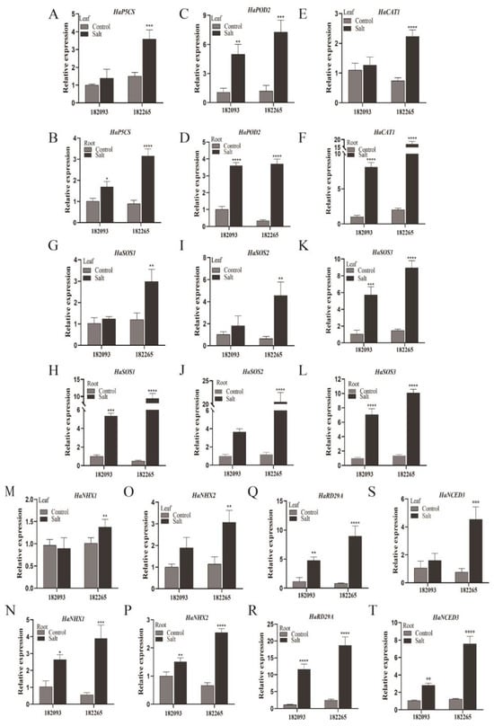 Expression analysis of various genes related to osmotic regulation, ROS clearance, ion transporter and stress response in salt-tolerant and salt-sensitive sunflower genotypes 182265 and 182093 under salt stress. The expression levels of the osmotic regulation gene HaP5CS (A,B), antioxidant enzyme genes HaPOD2 and HaCAT1 (C–F), plasma membrane Na+/H+ antiporter genes HaSOS1, HaSOS2, and HaSOS3 (G–L), vacuolar membrane Na+/H+ antiporter genes HaNHX1 and HaNHX2 (M–P), stress-responsive gene HaRD29A (Q,R), and the ABA synthesis key enzyme gene HaNCED3 (S,T) in leaves and roots of genotypes 182265 and 182093 were depicted. Asterisks (*) denoted significant differences between control and salt treatment within the same germplasm (* p < 0.05, ** p < 0.01, *** p < 0.001, **** p < 0.0001).