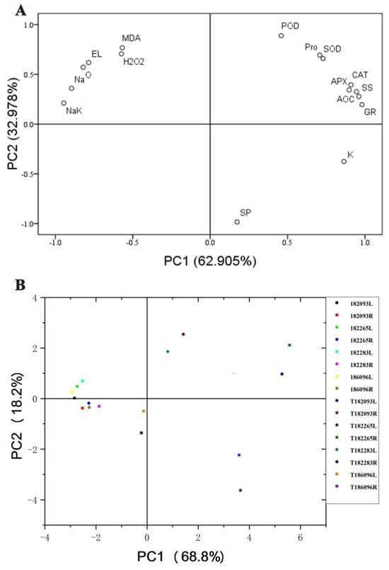Principal Component Analysis was performed to assess the physiological state and the response of different genotypes to salt stress, utilizing data from a range of physiological indices. (A) PCA of physiological indices under salt stress. (B) PCA of the different genotypes. SP: Soluble protein; SS: Soluble sugar; Pro: Proline; K: K+; Na: Na+; NaK: Na+/K+; APX: APX activity; CAT: CAT activity; GR: GR activity; POD: POD activity; SOD: SOD activity; AOC: T-AOC; O: O2− content; EL: Electrolyte leakage; H2O2: H2O2 content; T186096, T182093, T182283, and T182265: genotypes in the 350 mM NaCl treatment group. 186096, 182093, 182283, and 182265: genotypes in the control group. R: the root; L: the leaf.