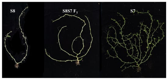 Parent and F1 of the test materials used in this experiment. S8 was the female parent with a lower branching number, and S7 was the male parent with multiple branching numbers; F1 was the cross between S8 and S7 with the branching number between parents.