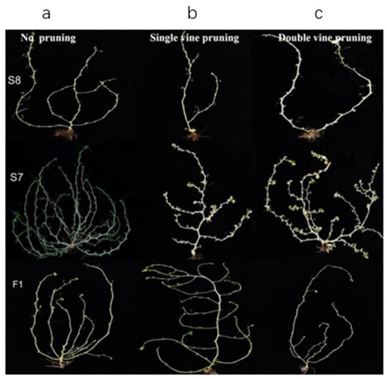 There are two commonly used pruning methods in melon production, which are single vine pruning and double vine pruning. To investigate the effects of different pruning methods on the number of branches in melon, we set no pruning as a control, and single vine pruning and double vine pruning were used to prune melon seedlings (Figure 3), and the results are shown in Table 3. There was no significant difference in the number of branches between S8, S7, and F1 under different pruning methods, indicating that the number of branches is mainly influenced by genetic factors. And observing the error values in each set of data, it can be found that the error value of double vine pruning is the smallest, indicating that after double vine pruning, the branching numbers of S8, S7, and F1 are more stable. Therefore, the double vine pruning method was selected for further mapping.
