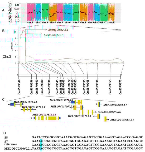 The candidate region identified by BSA-sequencing and QTL analysis for branch number in two seasons by RILs. (A) The candidate region investigated for branching number from the F2 population in 2021 using BSA sequencing; and (B) was QTL mapped based on the candidate chromosome 3 region using SSR maker scanning for RIL6 individuals for two seasons. The red line represents the results of RILs planted in Daqing City in spring 2022, and the green line represents the results of RILs planted in Hainan City in autumn 2022, with LOD values of more than 10. Sixteen pairs of molecular markers were used to reduce the candidate interval, and the candidate genes were located between CmSSR9556 and CmSSR9580. (C) Nine genes within the candidate interval were selected and (D) is the candidate gene sequence with a difference among the S8, S7, and reference genomes.