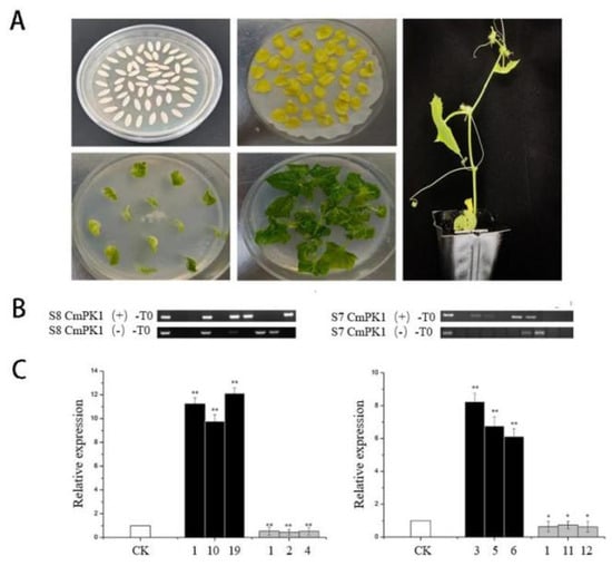 Leaf DNA was extracted from the transgenic plants for use as a template, and PCR amplification was carried out with primers designed based on the pBWA(V)BS vector. The pBWA(V)BS-CmPk1 plasmid served as the positive control, and water served as the negative control. The results revealed a distinct band at approximately 400 bp, corresponding to the target gene fragment, in the positive experimental plants and the positive control (Figure 8B), whereas no such band was observed in the negative control; these results indicated the successful integration of the pBWA(V)BS-CmPk1 plasmid into the cucumber genome. To eliminate false positives in the transgenic plants and ensure the integrity and accuracy of the experiment, RNA was re-extracted for qRT-PCR analysis. In S8, after the introduction of CmPk1 (+) (OE1, OE10, and OE19), CmPk1 expression was significantly upregulated 11.38-fold compared with that of the wild-type sample; after the introduction of CmPk1 (−) (OE1, OE2, and OE4), CmPk1 expression was decreased to 0.53 relative to that of the wild-type sample; in S7, after the introduction of CmPk1 (+) (OE3, OE5, and OE6), CmPk1 expression was significantly upregulated 7.66-fold compared with that of the wild-type sample; and after the introduction of CmPk1 (−) (OE1, OE11, and OE12), CmPk1 expression decreased to 0.69 relative to that of the wild-type sample (Figure 8C).