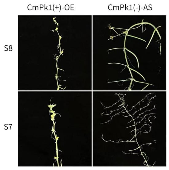 The branching of T0 generation CmPk1-positive plants was analysed, as shown in Figure 9. The CmPk1-overexpressing plants grew well. The CmPk1 (+)-OE-positive S8 plants presented no branching, and the CmPk1 (−)-AS-positive S8 plants presented significantly more branches than did the CmPk1 (+)-OE positive plants; each node presented at least 2 branches. The CmPk1 (+)-OE-positive S7 plants had no branches, and the CmPk1 (−)-AS-positive S7 plants had at least 2 or 3 branches in each node.