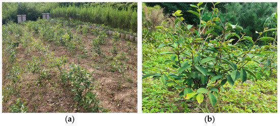 Camellia oleifera in this study. (a) Overview of the experimental site; (b) a single plant within the mapping population.