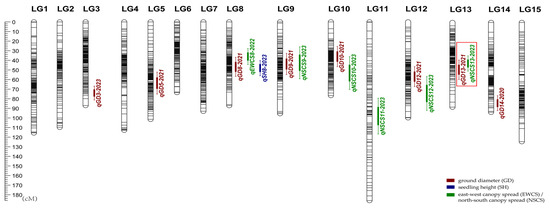 Position of growth trait QTLs on the genetic linkage map. Different colors indicate distinct QTLs related to growth traits, and the red frame represents a QTL cluster for ground diameter and canopy spread traits.