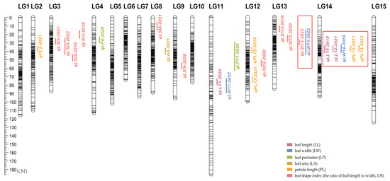 Position of leaf trait QTLs on the genetic linkage map. Different colors indicate distinct QTLs related to leaf traits, and each red frame represents a QTL cluster. The QTL cluster in LG13 represents QTLs for leaf shape index and leaf width traits; while the one in LG14 represents QTLs existing among leaf length, leaf width, and petiole length traits.