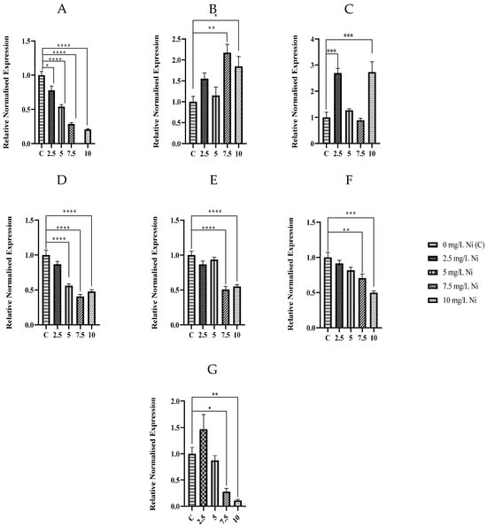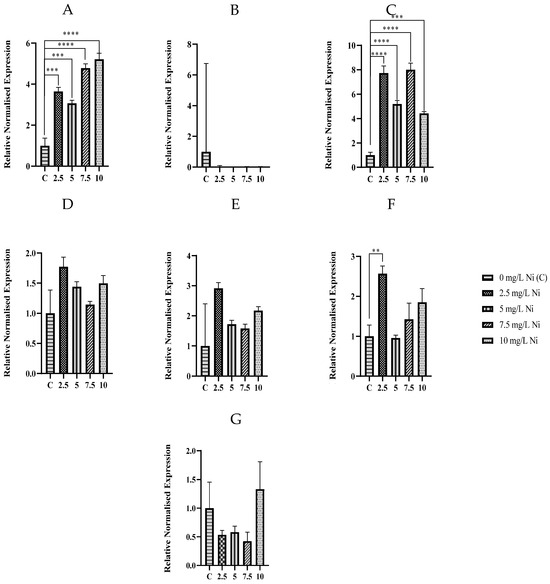Relative normalised expression of AtMT1A (A), AtMT1B (B), AtMT1C (C), AtMT2A (D), AtMT2B (E), AtMT3 (F), and AtPCS1 (G) in roots of plants exposed to increasing supplementing concentrations of Ni—2.5, 5, 7.5, and 10 mg L−1. Asterisks represent significant differences between the control and treatments at p-values as follows: ** p ≤ 0.01, *** p ≤ 0.001, and **** p ≤ 0.0001 (Dunnett’s test).