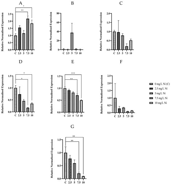 Relative normalised expression of AtMT1A (A), AtMT1B (B), AtMT1C (C), AtMT2A (D), AtMT2B (E), AtMT3 (F), and AtPCS1 (G) in mature leaves (ML) of plants exposed to increasing supplementing concentrations of Ni—2.5, 5, 7.5, and 10 mg L−1. Asterisks represent significant differences between the control and treatments at p-values as follows: * p ≤ 0.05, ** p ≤ 0.01, and *** p ≤ 0.001 (Dunnett’s test).