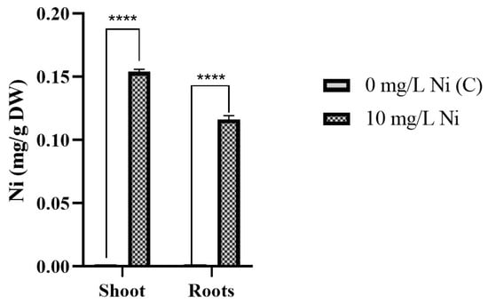 Average + SD levels of Ni in shoots and plants’ roots exposed to a supplementation of 0 and 10 mg L−1 concentrations. Asterisks represent significant differences between the control and treatment at p ≤ 0.0001 (Dunnett’s test).