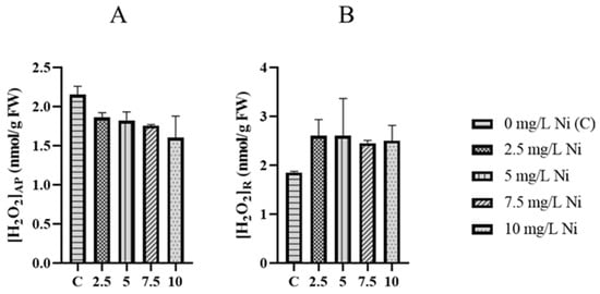 The results were not considered significant, but a tendency for the AP’s H2O2 levels to decrease and the R’s to increase with the increasing Ni concentration was noticeable (Figure 5A and B, respectively).