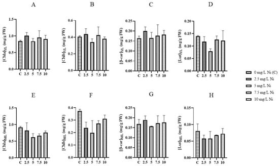 Average + SD levels of chlorophyll a in YL (A) and ML (E); chlorophyll b in YL (B) and ML (F); β-carotenes in YL (C) and ML (G); and lutein in YL (D) and ML (H), expressed as mg/g FW in plants exposed to the different supplementing concentrations of Ni—0, 2.5, 5, 7.5, and 10 mg L−1.