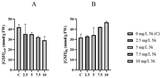 The concentration of GSH was measured in the AP and Rs. The results revealed no significant changes with the plants exposed to the different Ni concentrations. However, it was possible to visualise a similar pattern to that of the concentration of H2O2—with the increase in Ni concentration, the GSH quantity decreased in the AP and increased in Rs (Figure 7).