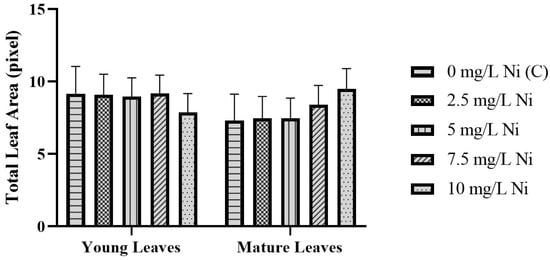 Average + SD total leaf area, expressed in pixels, of young and mature leaves of plants exposed to increasing concentrations of Ni—0, 2.5, 5, 7.5, and 10 mg L−1.