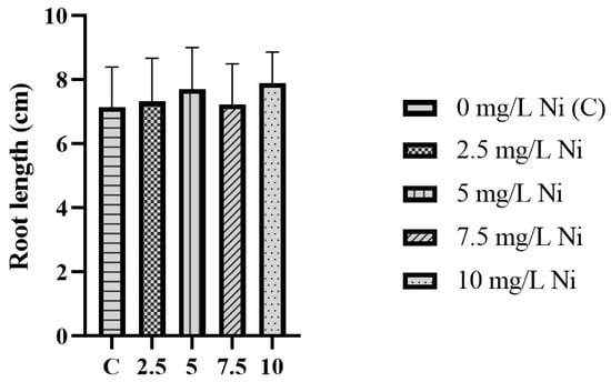 Average + SD root (R) length in cm of plants exposed to increasing supplementing concentrations of Ni—0, 2.5, 5, 7.5, and 10 mg L−1.