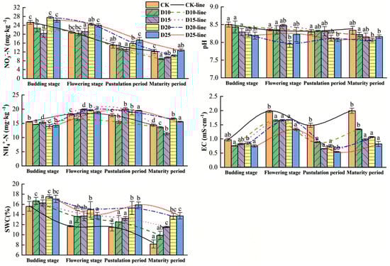 Figure 3 illustrates the changes in the soil physicochemical properties within the primary root zone across different treatments during the sunflower growth cycle. At the budding stage, the average soil water content increased by 6.10%, 7.78%, 8.03%, and 8.81% in the D10, D15, D20, and D25 treatments, respectively, compared to the CK treatment. No significant difference in soil pH was observed in the primary root zone between treatments as the sunflower plants progressed through their growth stages. During the rapid growth phase from flowering to pustulation, the soil NO3-N content in the main root zone declined sharply. The maximum NO3-N content dropped from 20.35~24.39 mg·kg−1 to 13.06~17.27 mg·kg−1. As the fertility period advanced, crop growth continued to absorb nutrients, and the soil NO3-N content reached its minimum during the maturity period. The soil salinity content, an indicator of soil salinization, was assessed using soil EC measurements, which indirectly reflect soil salinity levels. In the main root zone, soil salinity was in the range of 0.54~1.99 mS·cm−1, and the EC values of the treatments exhibited a fluctuating trend: it initially increasing, and then decreased, and subsequently increased as the fertility period progressed. Among the treatments, soil salinity in the main root zone decreased in the following order: CK > D10 > D20 > D15 > D25. When analyzing the changes in soil salinity after irrigation at the budding stage, it was found that the CK treatment displayed the most significant salinity increase from the budding stage to the flowering stage, followed by D10, D15, and D20, with D25 showing the smallest increase.
