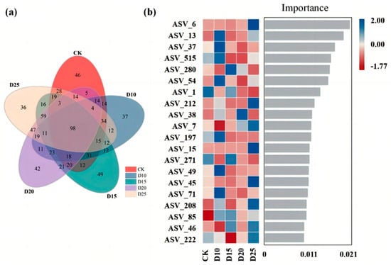 Figure 4. Venn diagram of OTUs of soil fungal communities. ((a) shows the number of OUTs for the five treatments, and (b) shows the key ASVs and their importance for the five treatments obtained from the random forest model).