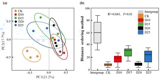 Figure 5. Principal component analysis (PCA) and PERMANOVA analysis of soil fungal community. ((a) shows the effect of drip irrigation tape burial depth on soil fungal community structure using PCA, and (b) shows the differences in fungal communities among different drip irrigation tape burial depth treatments analysed using PERMANOVA).