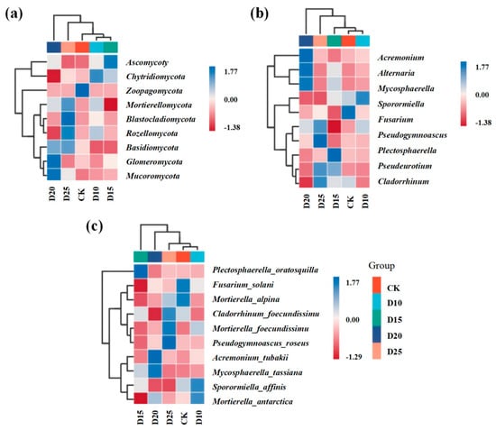 Figure 6. Relative abundance of fungal phylum and genus levels in different treatments ((a) top 10 at phylum level; (b) top 10 at genus level; (c) top 10 at species level).