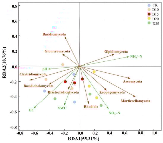 A redundancy analysis (RDA) of soil physicochemical properties and the fungal community structure at the phylum level in the 20–40 cm soil layer conducted during the budding stage revealed that the first and second axes explained 55.31 and 18.76% of the variation in the dominant fungal phylum, respectively. Together, these axes accounted for 74.07% of the observed variation in the fungal phyla (Figure 7). In this study, the soil fungal community structure was primarily influenced by EC, SWC, and NO3-N. A positive correlation was observed between NH4+-N and NO3-N, as indicated by the acute angle between them. The phylum Ascomycetes exhibited a positive correlation with the SWC and soil NH4+-N and a negative correlation with the soil EC and soil NO3-N. Similarly, the phylum Tephritidium was positively correlated with the SWC, NH4+-N, and NO3-N but negatively correlated with the soil EC.