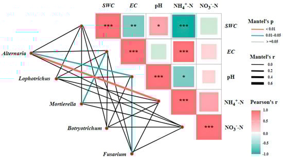 Figure 8. Correlation analysis between soil physical and chemical properties and dominant genera of soil fungi. (* indicates a highly significant correlation at p < 0.05; ** indicates a significant correlation at p < 0.01; *** indicates a highly significant correlation at p < 0.001).