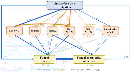 The structural equation model SMC yielded an R² value of 0.94, indicating that 94% of the variation in the soil fungal composition and diversity was explained by the model (Figure 9). Within the model, the soil NO3-N exhibited a significant direct positive effect on the soil fungal diversity (path coefficient = 0.44) and a direct negative effect on the soil fungal community structure. The soil EC also showed a strong direct positive impact on the soil fungal community composition and diversity with path coefficients of 0.26 and 0.53, respectively. Additionally, subsurface drip irrigation treatments were found to have a substantial indirect positive influence on the soil fungal diversity via changes in the SWC, soil NO3-N, and soil EC. In contrast, the same irrigation treatment had a weaker indirect positive effect on fungal diversity through modifications in the soil pH and bulk weight.