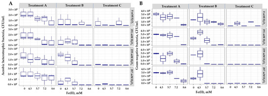 The CFU number in untreated AS was determined on PCA and EMB media and was [2.07 ± 0.83] × 108 CFU mL−1 and [3.30 ± 0.71] × 108 CFU mL−1, respectively. The changes in CFU number in AS after the 48 h treatment are shown in Figure 1 and Table A2 and Table A3. After Treatment A, the CFU count gradually decreased from 5.7 mM Fe(II) and 7.2 mM Fe(II) on PCA and EMB media, respectively. In that case, the addition of H2O2 did not influence the result. In turn, Treatments B and C considerably improved the disinfection effect, being the strongest for Gram-negative bacteria in the presence of Fe(II) and H2O2 (Figure 1). The highest log reduction of the “total number of heterotrophic bacteria” after 48 h of treatments A, B, and C was reached at 0.57 (191 mM H2O2 and 8.6 mM Fe(II)), 3.62 (287 mM H2O2 and 8.6 mM Fe(II)), and 4.71 (239 mM H2O2 and 8.6 mM Fe(II)), respectively (Table 1).