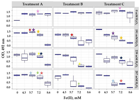 The FDA hydrolysis activity (in relative units) in AS samples subjected to the 48 h Fenton process. Treatment A—without additional treatment; Treatment B—thermal treatment (70 °C, 1 h); Treatment C—thermal (70 °C, 1 h) + UV treatment (253.7 nm, 30 min). Significant (p < 0.05) differences between sets, which were treated by the same concentration of Fe(II) and H2O2 but differed by the type of physical treatment (Treatments A, B, and C), are designated by asterisks of one color.