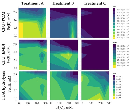 Contour plots of the CFU count determined on PCA (A) and EMB (B) media, as well as FDA hydrolysis activity (C), after 48 h treatment of AS by the Fenton process at different concentrations of H2O2 and Fe(II).