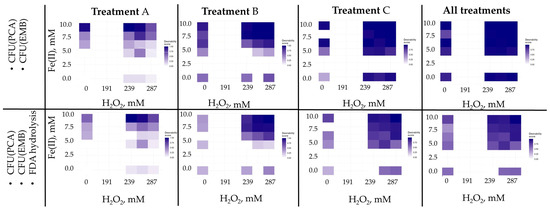 Optimal concentrations of H2O2 and Fe(II) determined by a desirability function approach for each treatment type separately and all treatment types together. Two calculation sets were performed taking into consideration the following responses: [CFU(PCA) and CFU(EMB)] and [CFU(PCA), CFU(EMB), and FDA hydrolysis].
