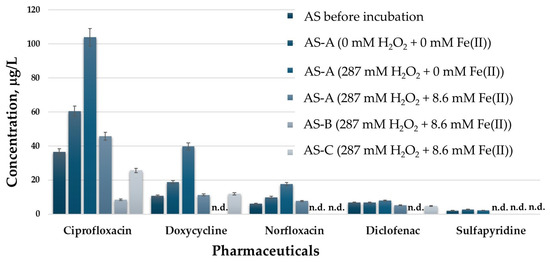 Concentration of pharmaceutical substances in AS before and after 48 h treatment. AS-A—without additional physical treatment; AS-B—thermal treatment (70 °C, 1 h); AS-C—thermal (70 °C, 1 h) + UV treatment (253.7 nm, 30 min). n.d.—not detected.