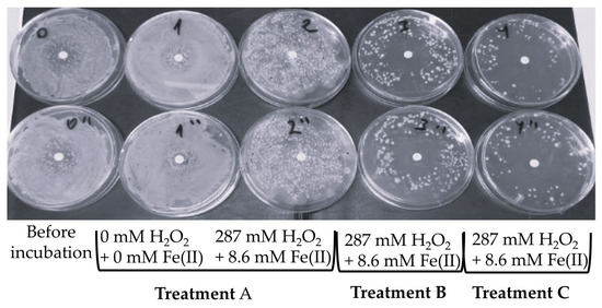 The Fenton reaction was recently applied for the pretreatment of pharmaceutical sewage sludge (dw 6.4%, pH 7.2) prior to anaerobic digestion. The optimal dose of reagents was 6.0 g L−1 (176 mM) H2O2 and 1.5 g/L (27 mM) Fe(II) with a retention time of 24 h, which resulted in a considerable decrease of toxicity for anaerobic bacteria with improving methane fermentation [41]. The optimal combination of Fenton reagents reported by [41] is close to the range of H2O2 and Fe(II) concentrations used in our study. The optimum ratios of H2O2/Fe(II), reported by other authors, differed, e.g., 1.0 [42], 4.0 [41], and 14.3 [43]. Our results showed that a ratio of 20–30 is optimal for sludge disinfection. A higher ratio of H2O2/Fe(II) is explained by a comparatively low concentration of Fe(II) taken in our study. Most probably, an increase in Fe(II) concentration (above 8.6 mM) would enhance a disinfection effect in AS. This aspect is supposed to be checked in our further study, which would be economically beneficial for Treatment A, avoiding additional costs for heating.