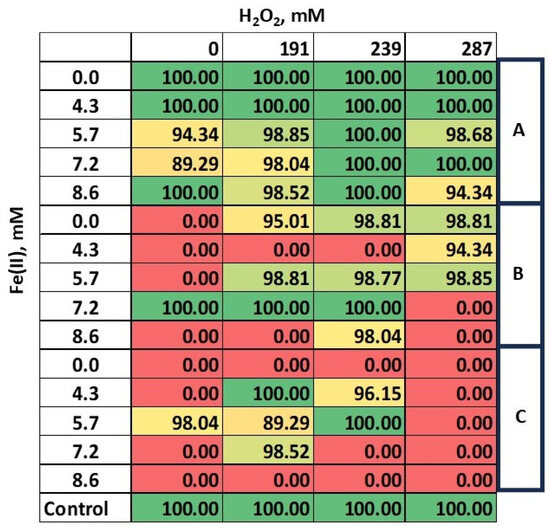 A strong oxidation process initiated by the Fenton reaction could affect the viability of different organisms. An ecotoxicity screening test of AS was performed with crustaceans T. platyurus. Treatment A did not affect the viability of T. platyurus despite relatively high concentrations of H2O2 and Fe(II) added to AS. In turn, additional physical (thermal and UV) treatment resulted in high ecotoxicity, especially in the sets subjected to Treatment C (Figure 7). Some inconsistent results on viability appeared among different combinations of H2O2 and Fe(II) concentrations in Treatments B and C, i.e., a decrease of viability was not gradual according to increasing concentration of reagents. Nevertheless, the trend of increasing ecotoxicity under tested conditions was observed (Figure 7).