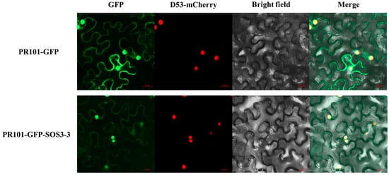 Subcellular localization typically reflects biological function, and SOS3-3 was predicted to be localized in the membrane system (Cell-PLoc 2.0 package (sjtu.edu.cn)). In order to confirm localization, SOS3-3 was fused to the N-terminus of green fluorescent protein (GFP) driven by the 35Spromoter. The PR101-GFP-SOS3-3 construct and PR101-GFP were transformed into tobacco leaves, respectively. The SOS3-3-GFP fusion protein was observed in the cell membrane and nucleus, whereas PR101-GFP, as a control, was detected throughout the cell (Figure 1).