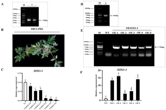 Identification of VSOS3-3 and OESOS3-3 plants. (A) 1. PCR amplification results of SOS3-3 silent fragment of tomato; (B) phenotype of TRV2-PDS report plant; (C) the silencing efficiency of SOS3-3 gene, the expression level of SOS3-3 in VSOS3-3 plants; (D) 1. PCR amplification results of SOS3-3 overexpression fragment; (E) genomic PCR analysis of OESOS3-3 transgenic lines; (F) expression levels of SOS3-3 in T1 generations for OESOS3-3 transgenic lines. M. DL2000 Marker. Data was the mean of three biological repeats ± standard error (SE). Different letters represented significant difference (p < 0.05).