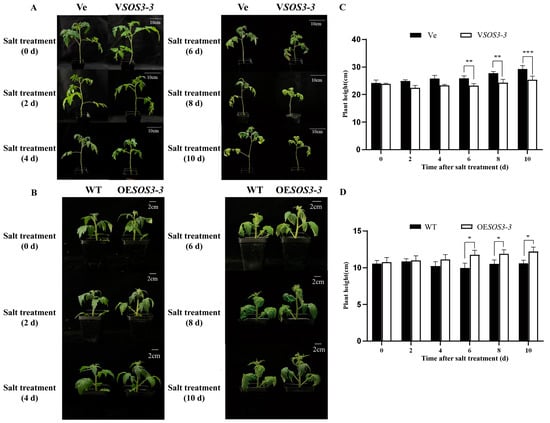 Growth changes of VSOS3-3 and OESOS3-3 under salt stress. (A) Phenotypes of Ve and VSOS3-3 under salt stress; (B) phenotypes of WT and OESOS3-3 under salt stress; (C) changes in plant height of Ve and VSOS3-3 under salt stress; (D) changes in plant height of WT and OESOS3-3 under salt stress. Asterisks indicate significant differences between VSOS3-3 and Ve as well as WT and OESOS3-3. *, p < 0.05; **, p < 0.01; ***, p < 0.001, Student’s t test.
