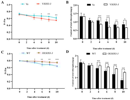 Effects of SOS3-3 silencing and overexpression on Fv/Fm and the total chlorophyll content of tomato under salt stress. (A) Fv/Fm of Ve and VSOS3-3 under salt stress; (B) content of total chlorophyll of Ve and VSOS3-3 under salt stress; (C) Fv/Fm of WT and OESOS3-3 under salt stress; (D) content of total chlorophyll of WT and OESOS3-3 under salt stress. Asterisks indicate significant differences between VSOS3-3 and Ve as well as WT and OESOS3-3. *, p < 0.05; **, p < 0.01; ***, p < 0.001, Student’s t test.