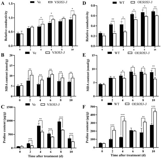 The REC of plant leaves and the content of MDA can indicate the degree of damage of a plant cell membrane under stress. We found that the REC and MDA content of VSOS3-3 leaves was higher than that of Ve leaves (Figure 5A,B). When suffering salt stress, plants can adjust osmosis by accumulating proline to alleviate the damage. The content of Pro in plants can reflect the salt tolerance of plants. The results showed that proline content in VSOS3-3 was significantly lower than in Ve plants (Figure 5C). Indeed, on the contrary, the REC and MDA content levels of OESOS3-3 plants were lower than those of WT plants (Figure 5D,E), and the Pro content in OESOS3-3 plants was higher than in WT (Figure 5F).