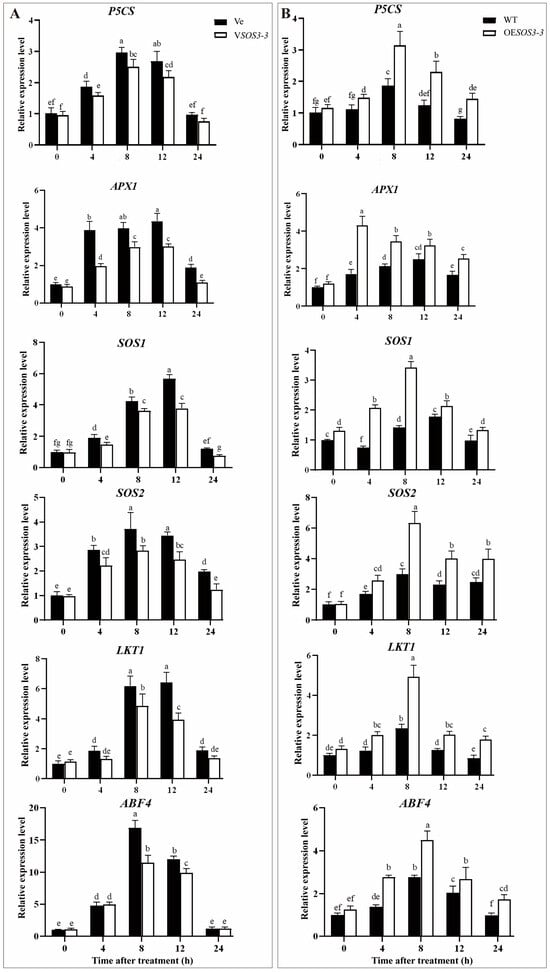 The gene expression of P5CS, closely related to the proline synthesis pathway, was further analyzed, which involved the osmotic regulation of plants under salt stress. The results showed that the expression level of P5CS was obviously lower in VSOS3-3 than in Ve after 4 h, 8 h, and 10 h of salt stress (Figure 6A), and the expression level of P5CS was markedly higher in OESOS3-3 than in WT after 4 h, 8 h, 12 h, and 24 h (Figure 6B). Interestingly, in the P5CS expression in VSOS3-3, OESOS3-3 and Ve, WT exhibited the highest at 8 h of salt stress (Figure 6).