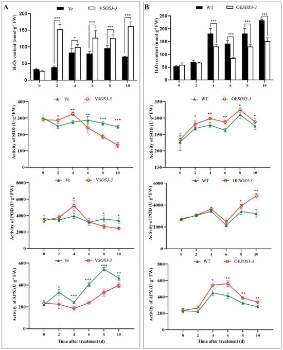 Effects of VSOS3-3 and OESOS3-3 on H2O2 content and antioxidant enzyme activity for tomato under salt stress. (A) H2O2 content and antioxidant enzyme activity of Ve and VSOS3-3 under salt stress; (B) H2O2 content and antioxidant enzyme activity of WT and OESOS3-3 under salt stress. Asterisks indicate significant differences between VSOS3-3 and Ve as well as WT and OESOS3-3. *, p < 0.05; **, p < 0.01; ***, p < 0.001, Student’s t test.