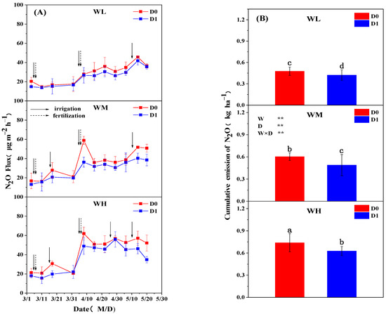 Dynamics of soil N2O fluxes (A) and cumulative emissions of N2O (B) under different irrigation regime and DMPP addition. WH: High irrigation level; WM: Medium irrigation level; WL: Low irrigation level. D0: Without DMPP addition; D1: With DMPP addition. W: Irrigation regime; D: DMPP addition; W × D: Irrigation and DMPP interaction. Error bars indicate the standard deviations of the means (n = 4). Different letters mean significant differences at p ≤ 0.05. ** mean significant differences at p ≤ 0.01.