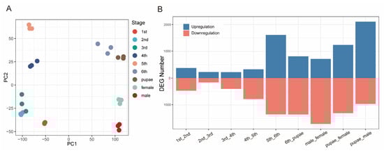 Using the reference genome and official gene sets of S. frugiperda, we calculated the expression levels of 14,922 protein coding genes from 27 transcriptome samples spanning nine developmental stages. After filtering out genes with low read counts (<100), we obtained a high-quality read count matrix comprising 13,622 genes. To identify DEGs between adjacent stages, we used DESeq2 to generate nine comparison groups. The normalized counts produced by DESeq2 were utilized for downstream analyses. Principal component analysis (PCA) revealed minimal differences among samples within the same stage (Figure 1A), confirming the reliability of the transcriptome data used. In contrast, significant differences were observed among samples from different stages.