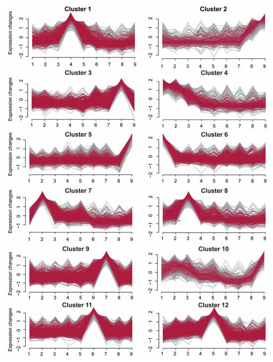 Next, time-series analysis of DEGs revealed 12 distinct expression clusters (Clusters 1–12), each exhibiting unique temporal expression patterns across nine developmental stages (Figure 2). Notably, Clusters 1, 3, 5, 6, 7, 8, 9, 11, and 12 show characteristic peaks in expression at specific stages, followed by declines or stabilization, suggesting stage-specific regulatory roles. In contrast, Clusters 2, 4, and 10 demonstrate more moderate changes without pronounced peaks, implying broader regulatory functions across multiple stages. This clustering underscores the temporal dynamics of DEG expression, indicating that certain gene groups may play pivotal roles at specific stages, while others support ongoing developmental processes throughout the lifecycle.