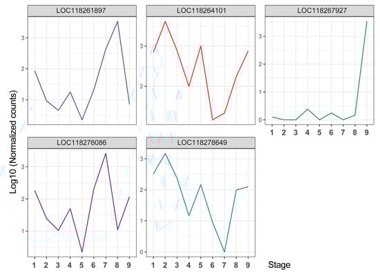 We then explored the expression patterns of these five DEGs, which revealed distinct stage-specific expression trends (Figure 4). Four of these DEGs (LOC118261897, LOC118264101, LOC118276086, and LOC118278649) exhibited peaks and troughs in expression levels, indicating a significant correlation with the developmental stages of the insect. In contrast, LOC118267927 maintained low expression levels from stages 1 to 8 but showed a sharp increase at the male adult stage, suggesting a specialized function in male adults.
