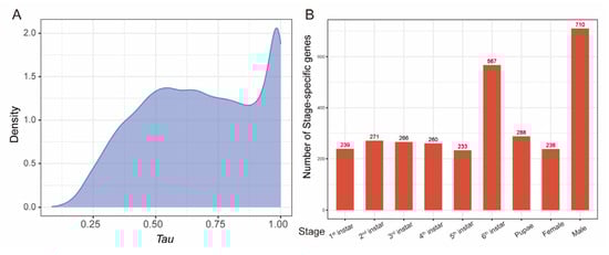 (A) Distribution of the Tau index for 13,622 genes. (B) Number of SSGs identified in stages of S. frugiperda.